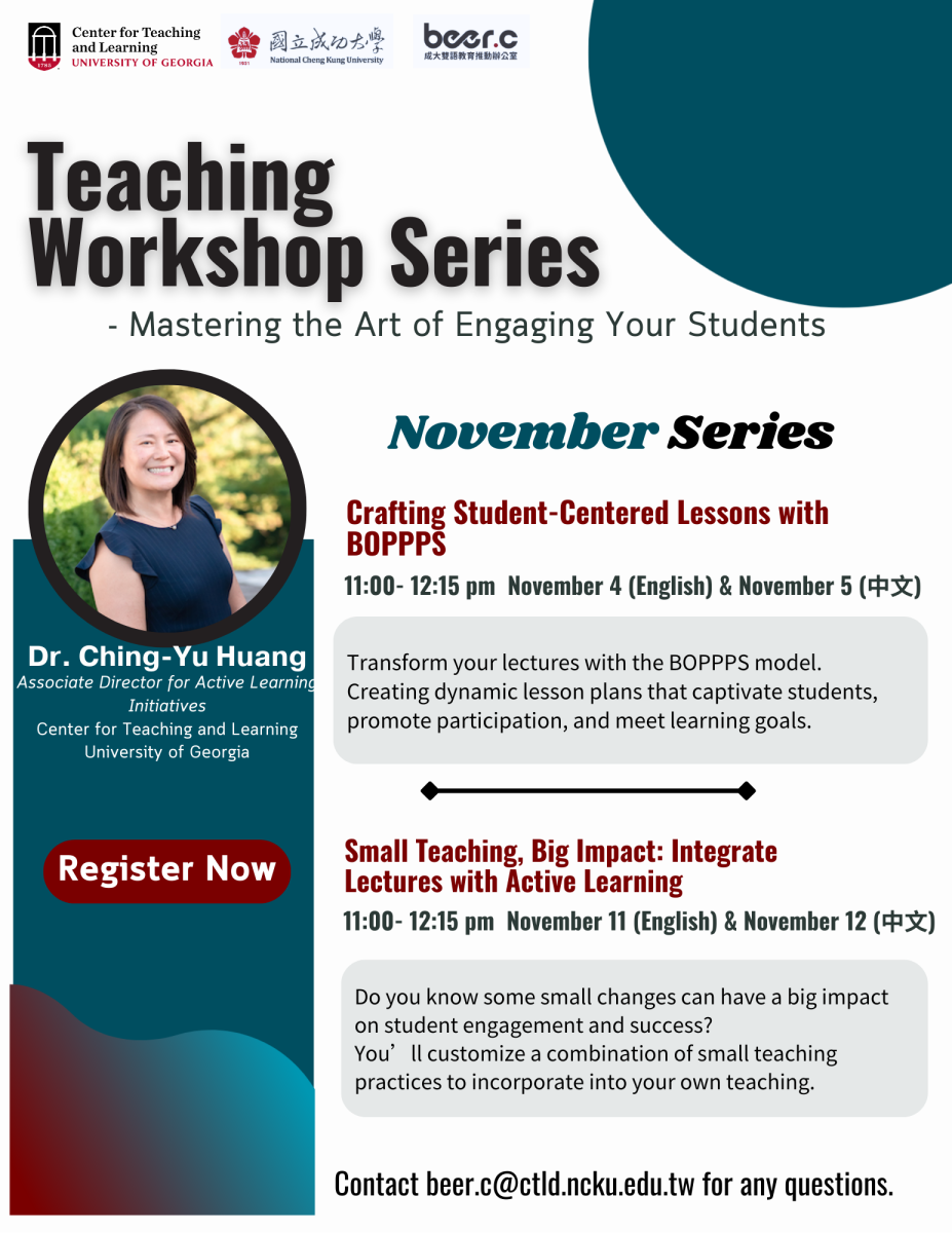 2. 如有相關疑問,請洽雙語教育推動辦公室卓小姐 (電話:(06)275-7575分機50202轉31,Email:beer.c@ctld.ncku.edu.tw)