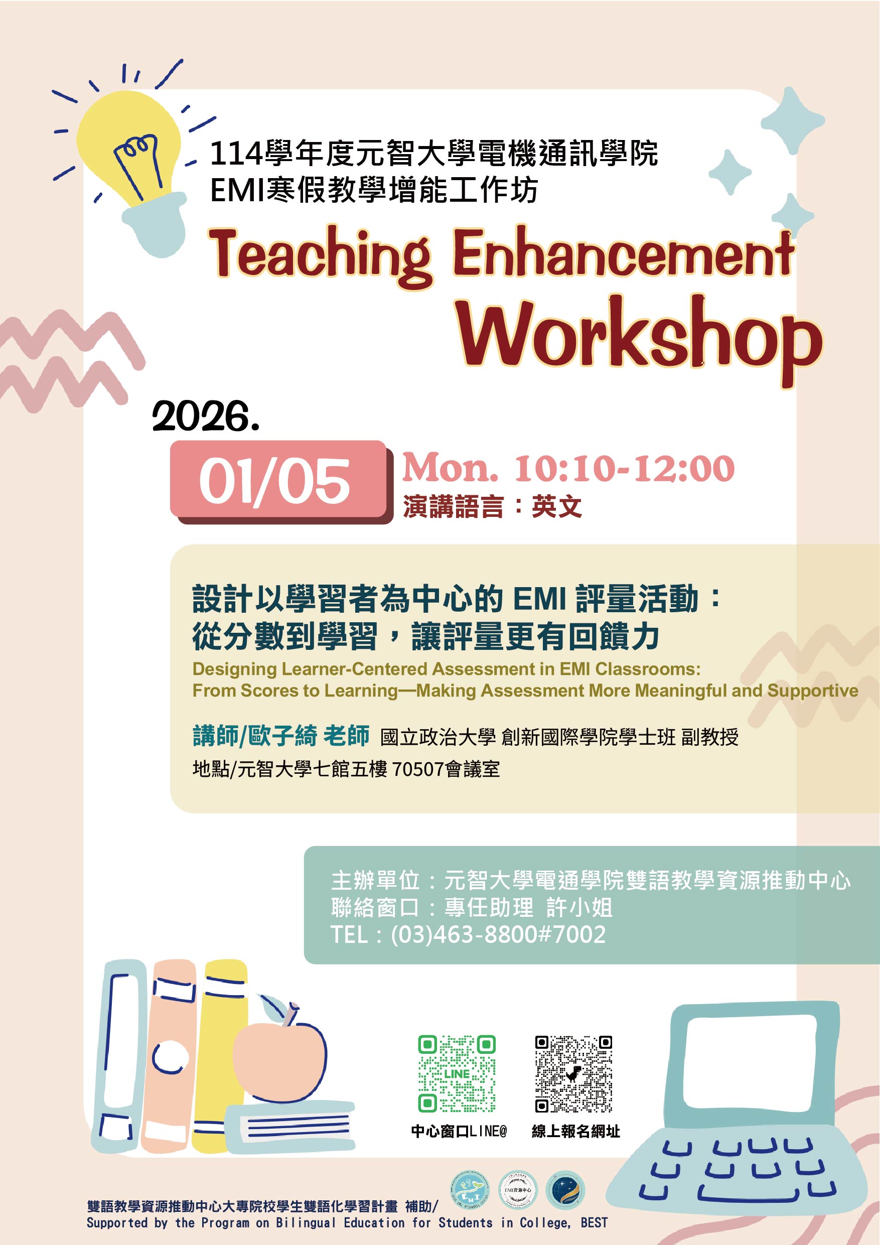 一、為增進EMI課程教學技巧,並提升教師EMI教學能力,元智大學電機通訊學院於114學年度辦理「EMI寒假教學增能工作坊」,歡迎各大專校院教師報名參與。