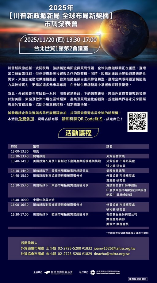 【轉知】外貿協會最新市調發表會,免費報名!! 11/20 (星期四) 2025年【川普新政掀新局 全球布局新契機】市調發表會!
