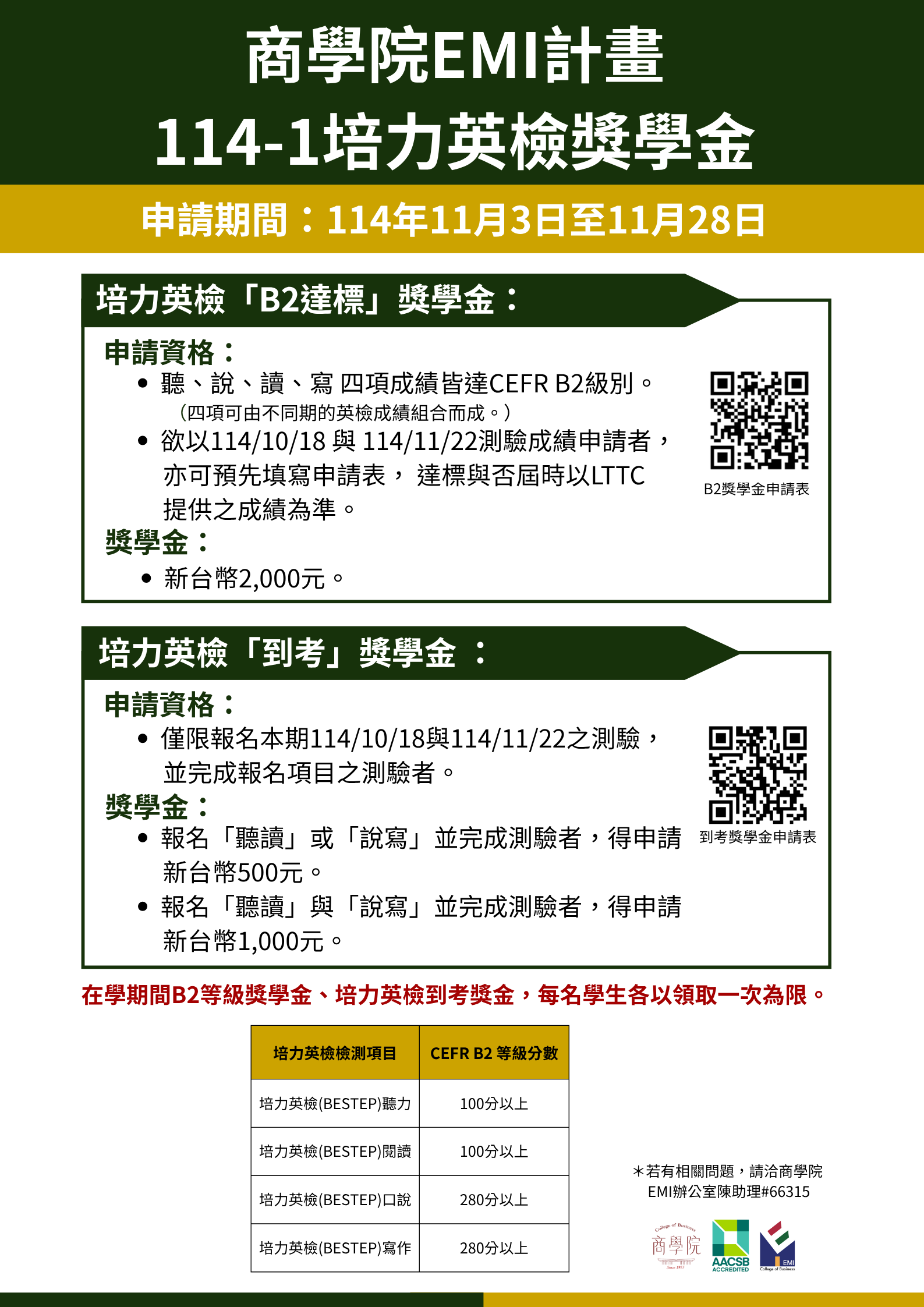 商學院EMI計畫114-1學年度學生英檢獎學金,即日起開始申請,至11月28日截止!
