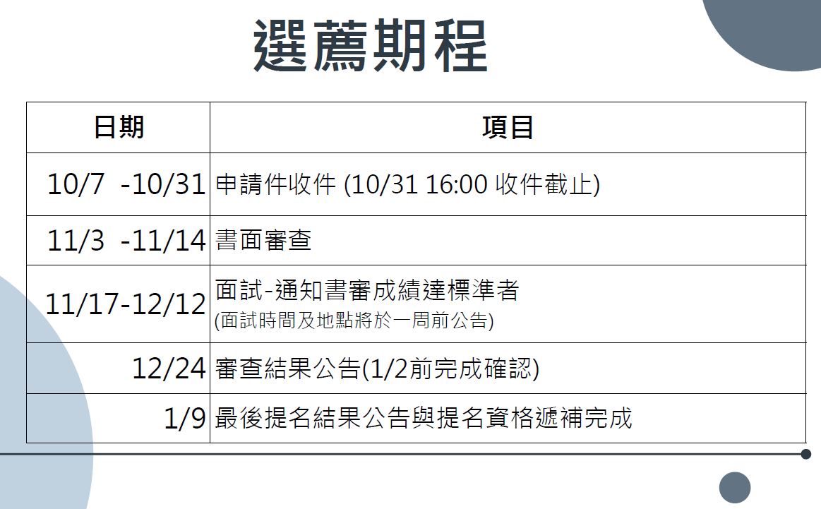 3. 書審通過之申請者,面試時間將另行通知,請務必確認所提供之信箱資訊正確。