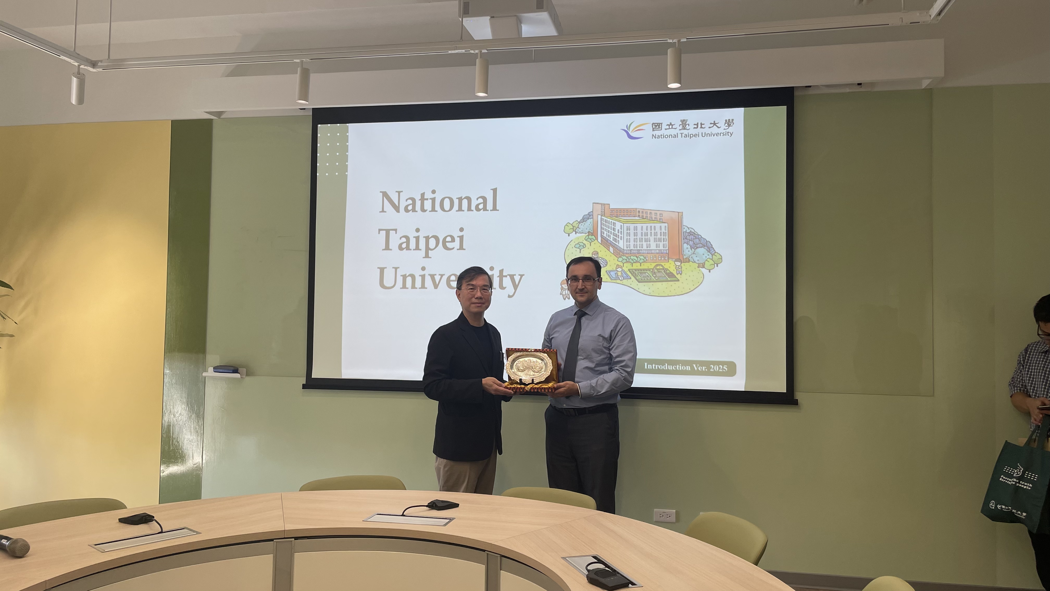 2025年10月15日上午,來自柬埔寨的Paragon International University校長Dr. Bulat G. Akhmetkarimov與副校長Mrs. Sheue Li Ng,在玉山銀行玉山人力資源處資深協理郭宸巖、玉山永續長辦公室襄理羅心閔,以及玉山銀行柬埔寨子行聯合商業銀行副理余品依的陪同下,拜訪國立臺北大學商學院,進行合作交流與洽談。